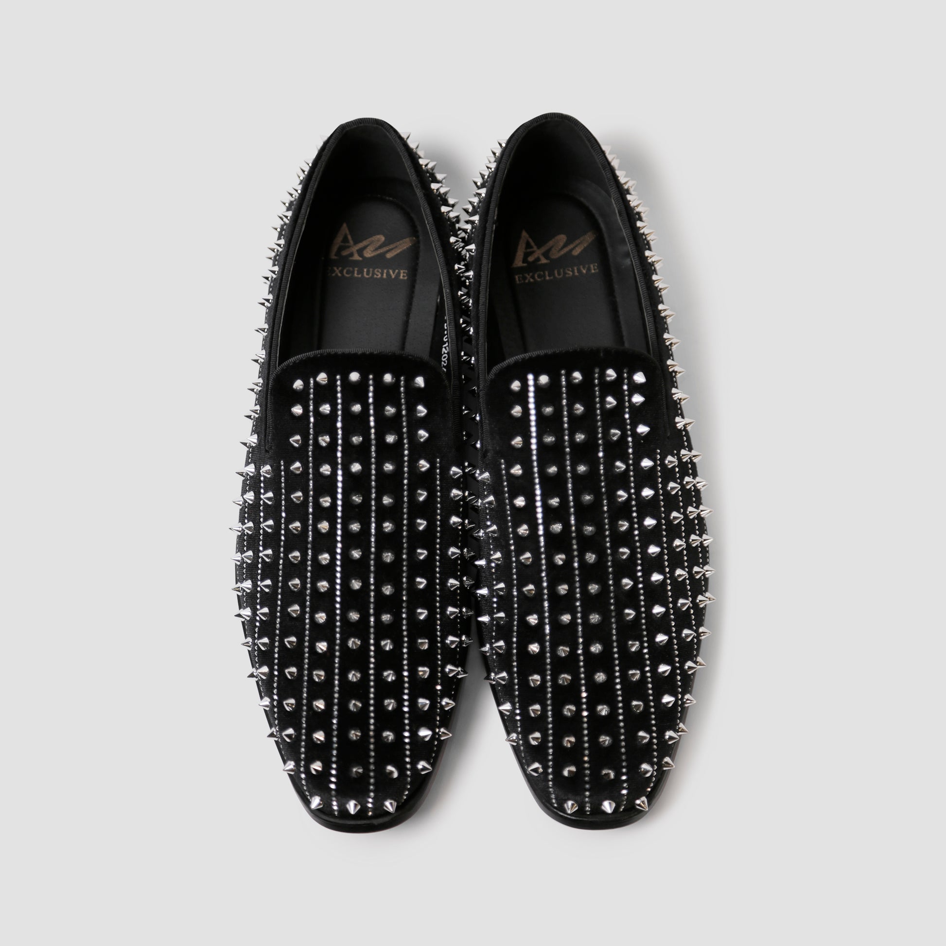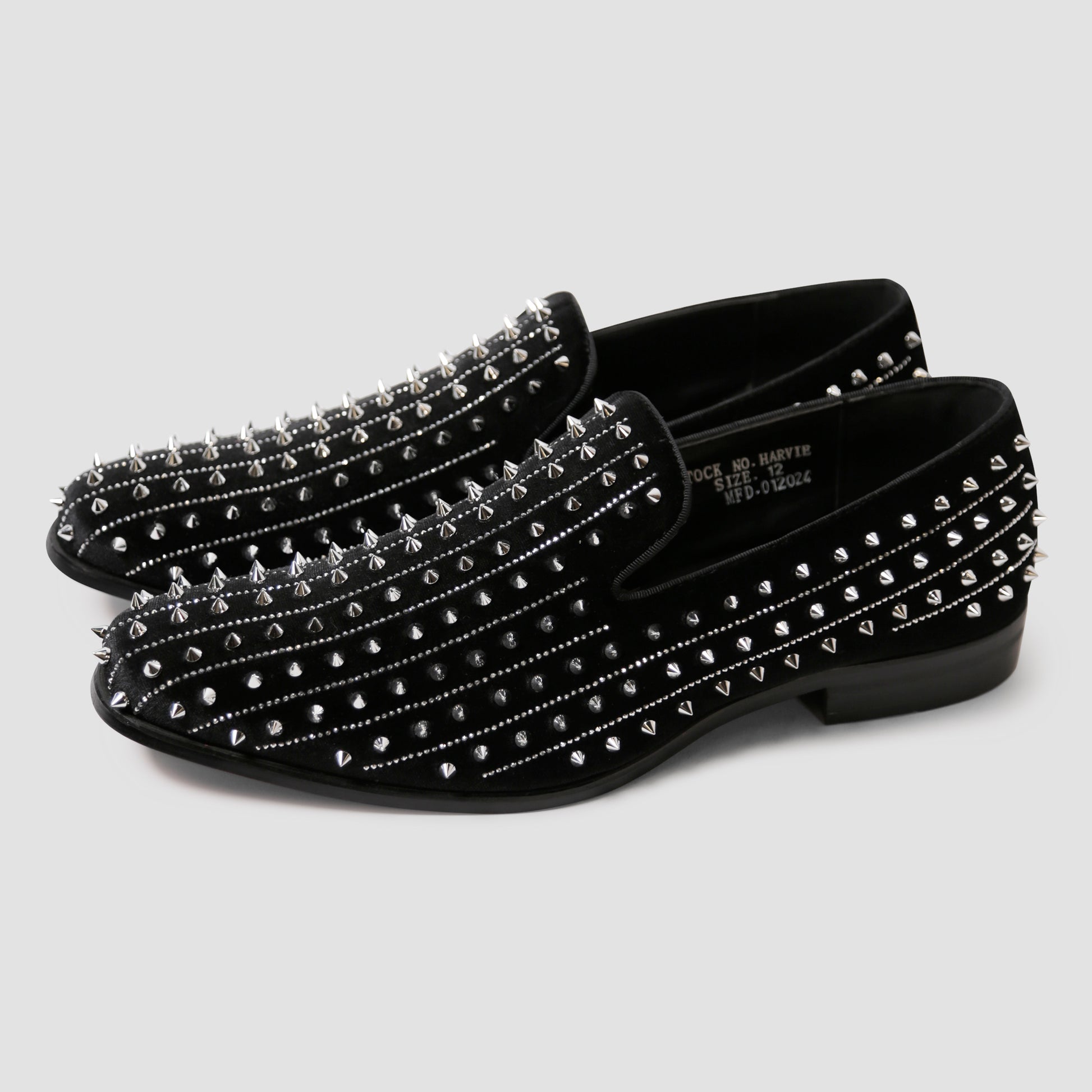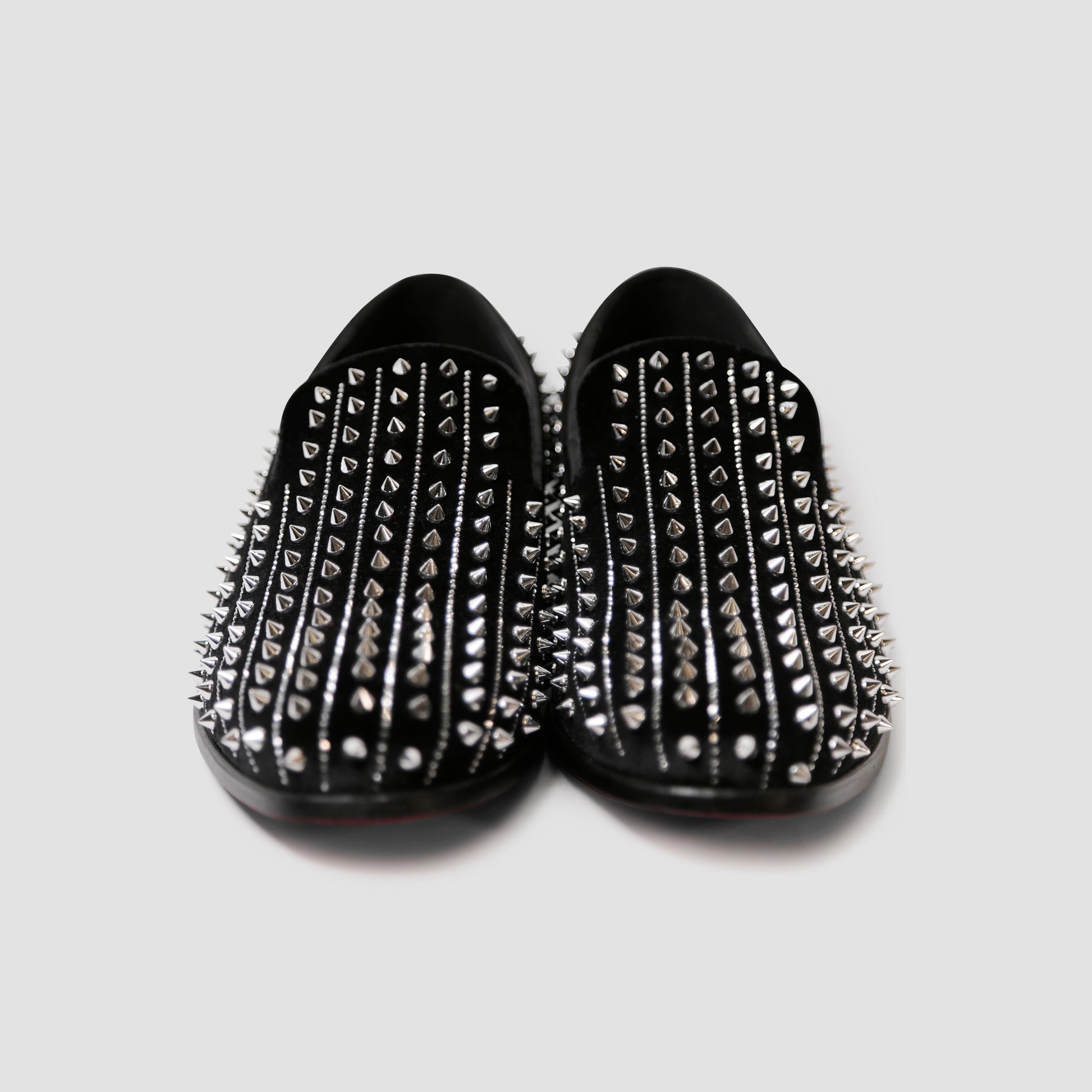 These sleek black loafers are adorned with striking silver-tone spikes, creating a look that’s both edgy and sophisticated. Perfect for those who want to stand out with a daring sense of style.