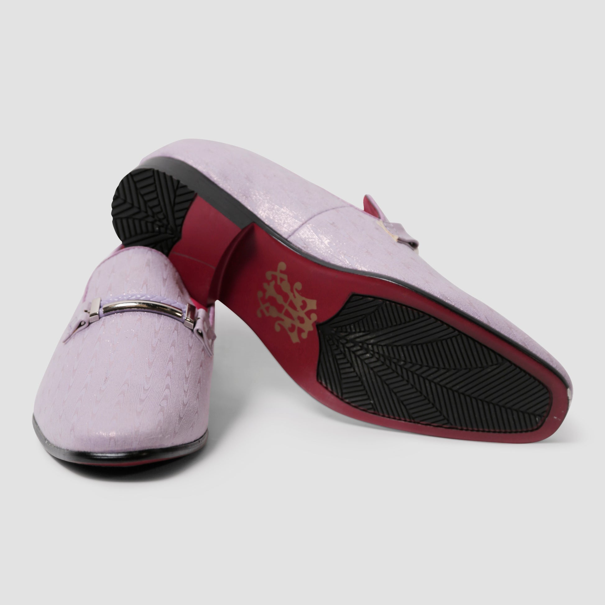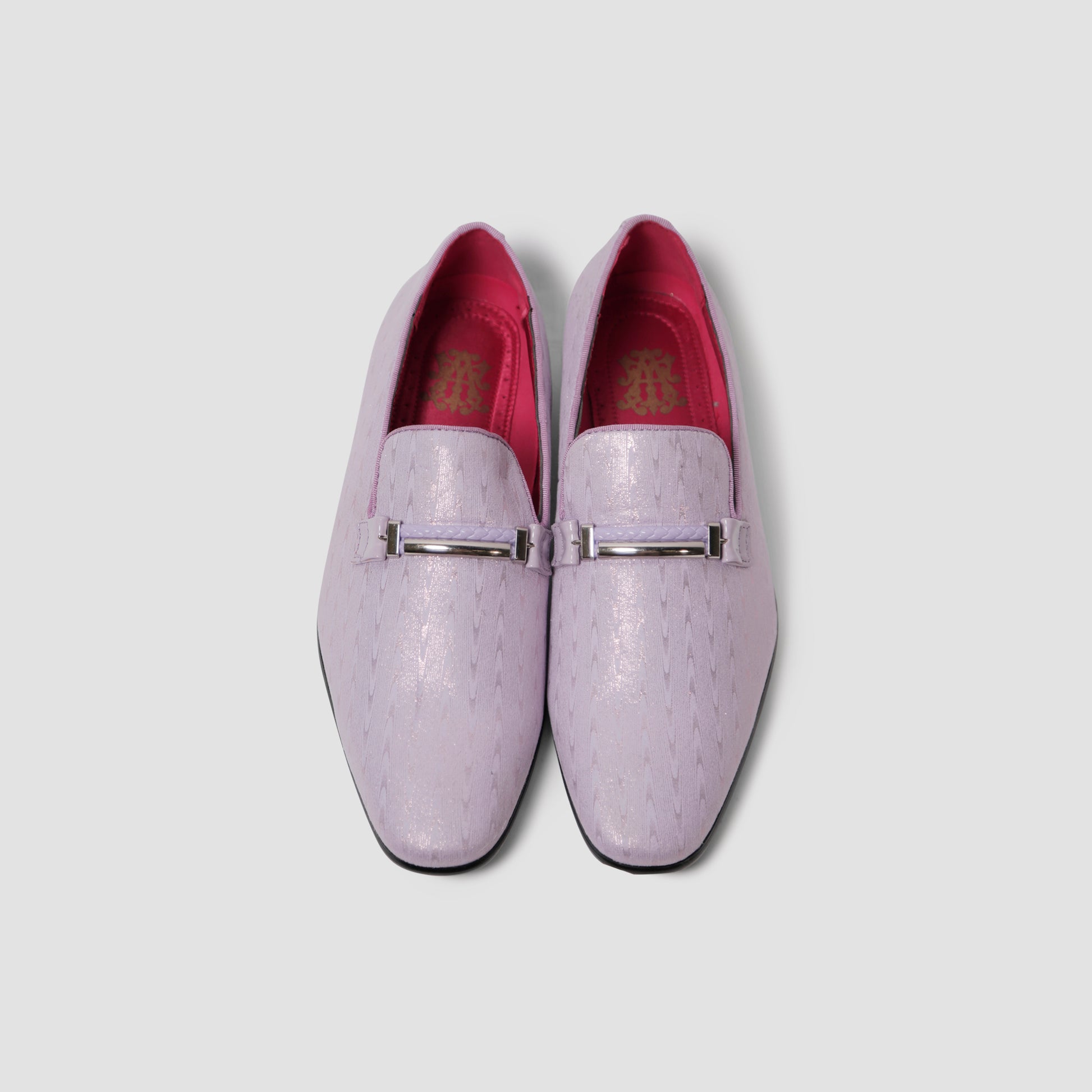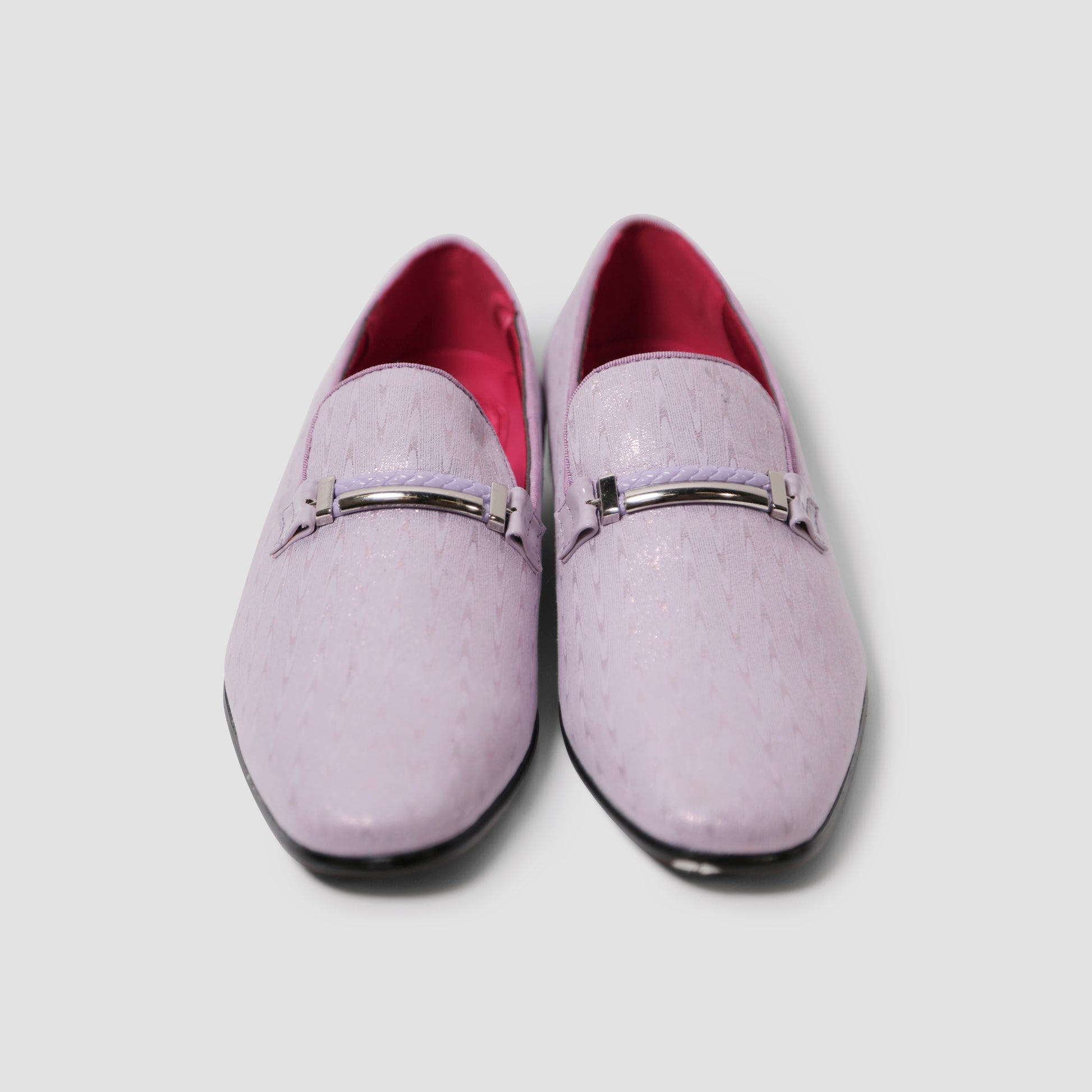 These shoes feature a soft lilac hue with a subtle geometric pattern and a sleek silver-tone bar. The vibrant pink lining adds a bold contrast, making them perfect for adding a touch of sophistication to any outfit.