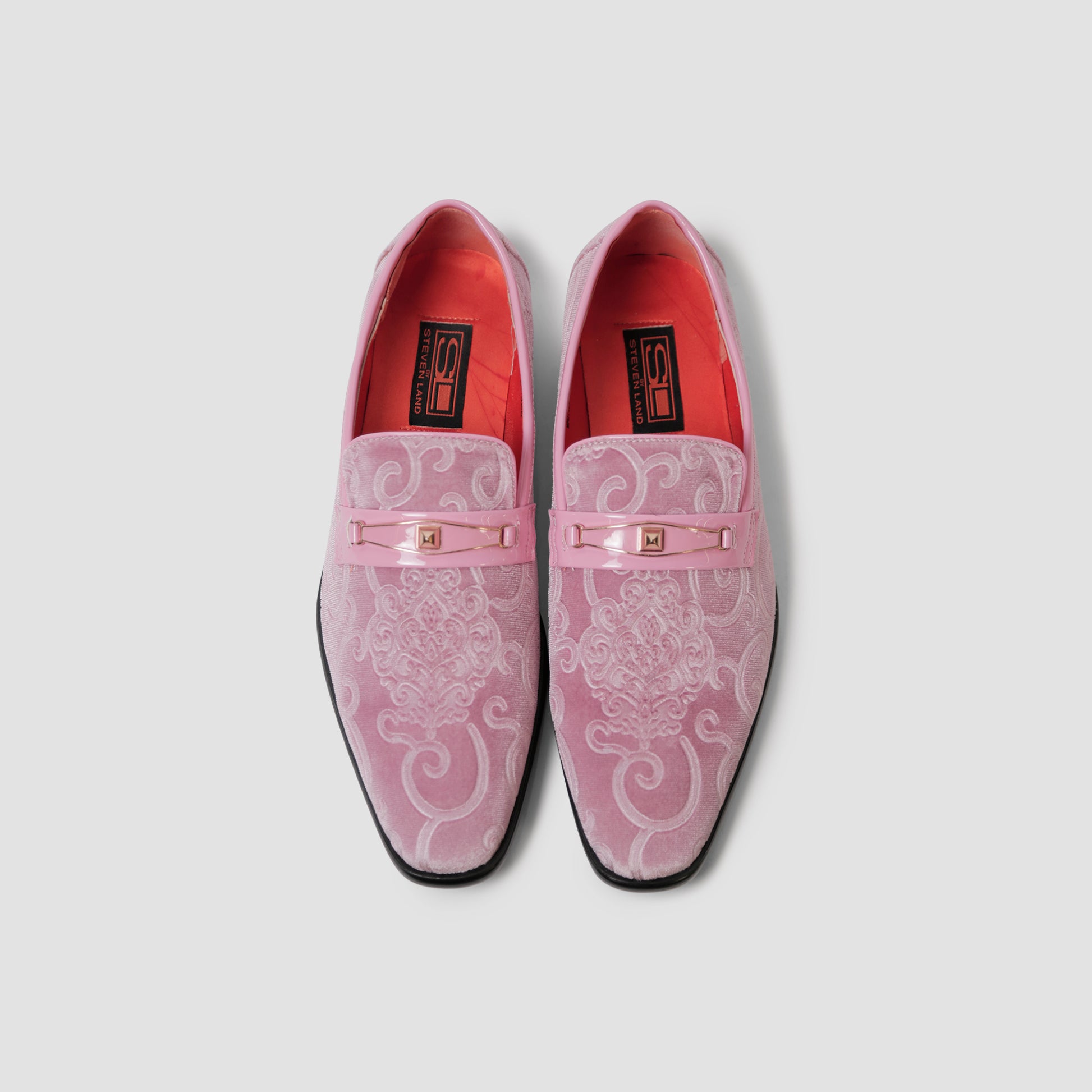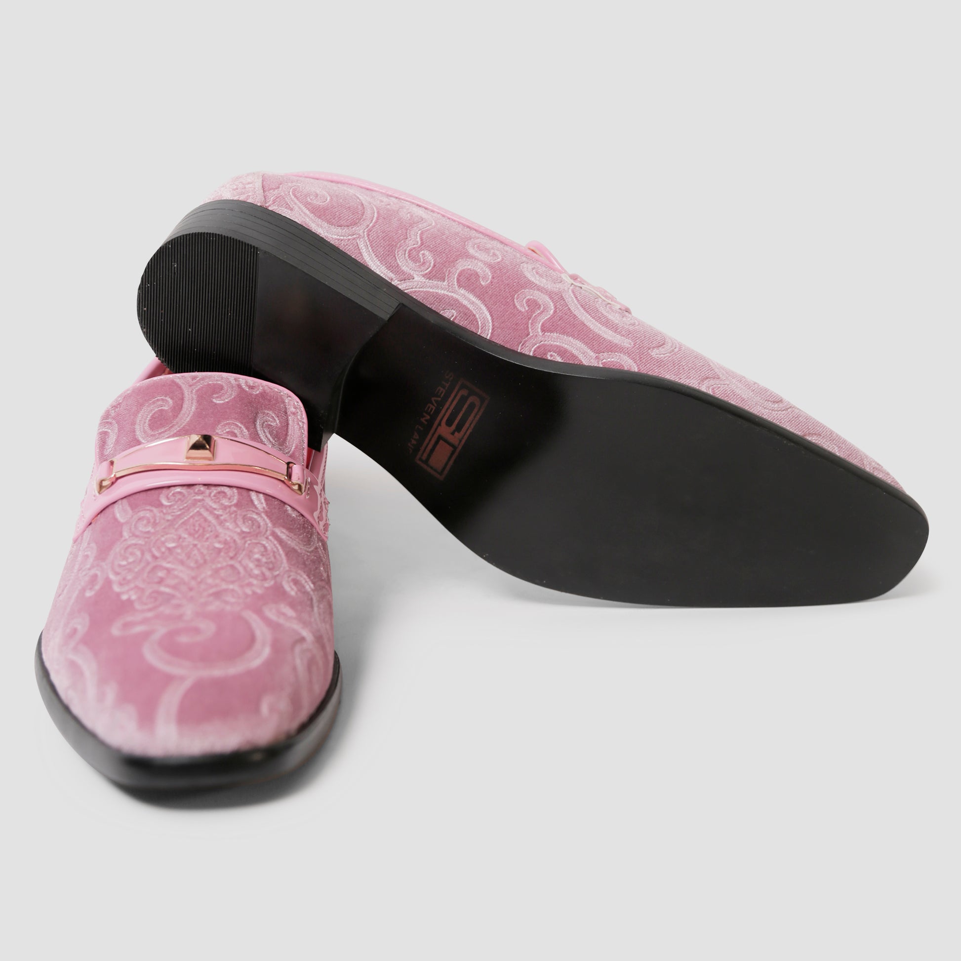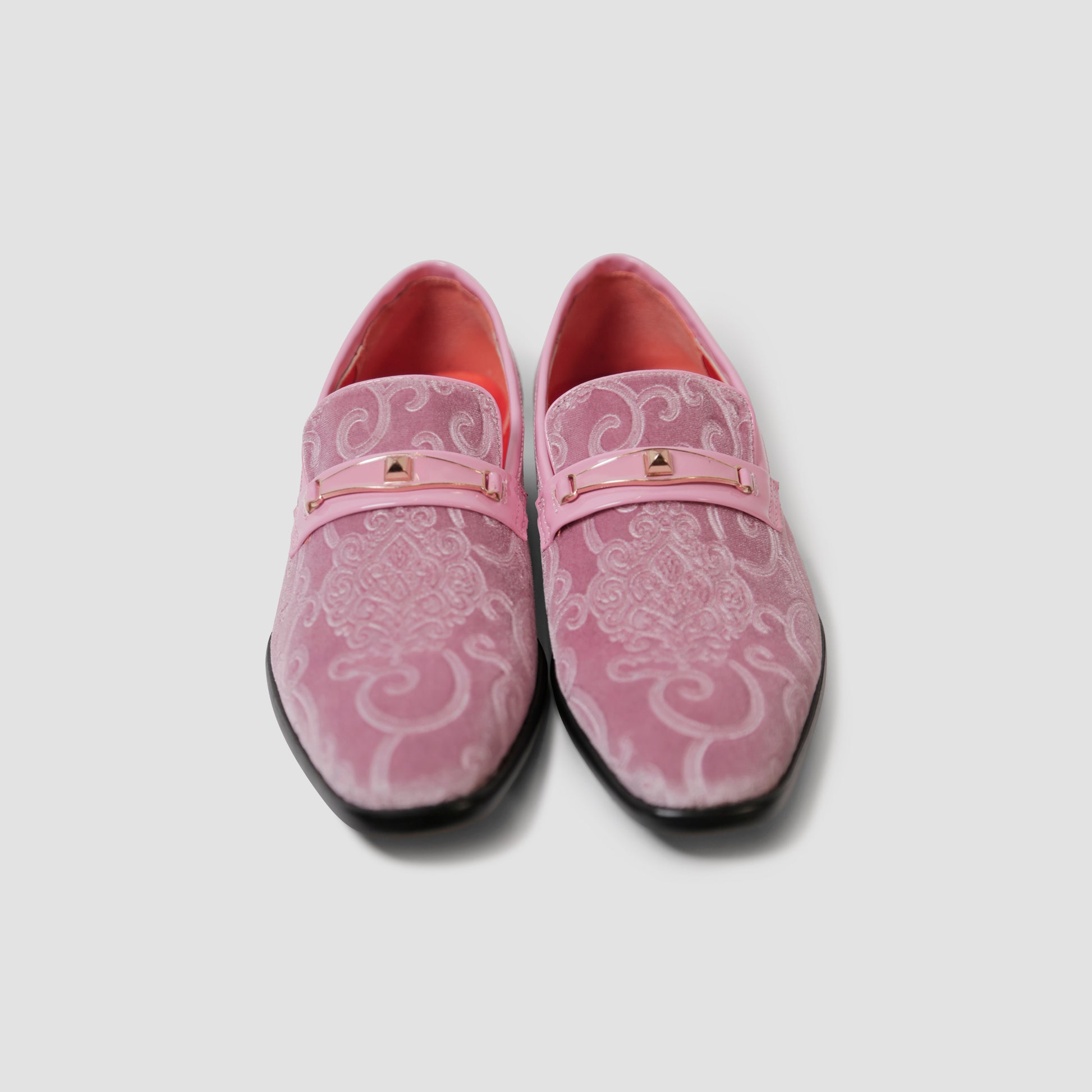 These elegant shoes feature a soft pink velvet finish with an intricate embossed paisley design, paired with a glossy rose gold-tone bar.